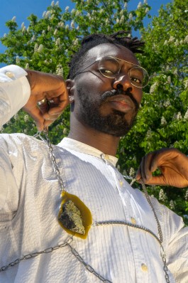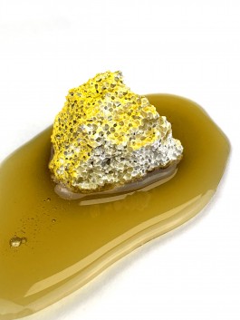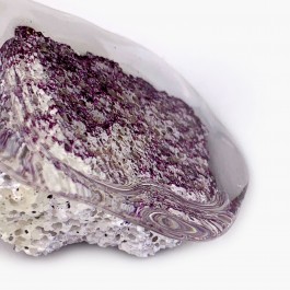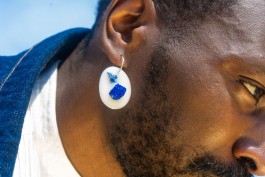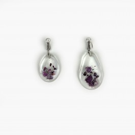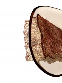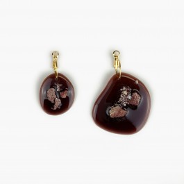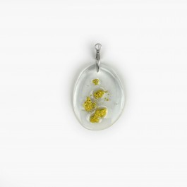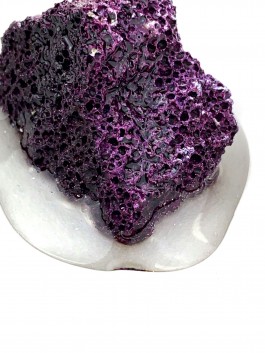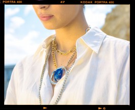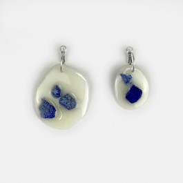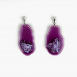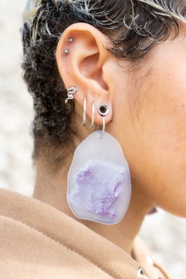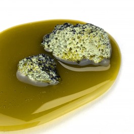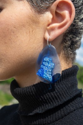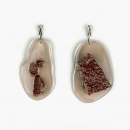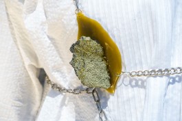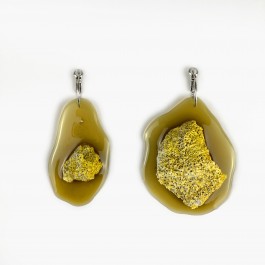 Pierres alvéolaires teintées, résine époxy, apprêts et chaînes en métal inoxydable.