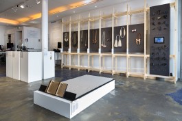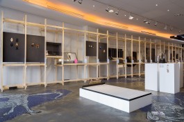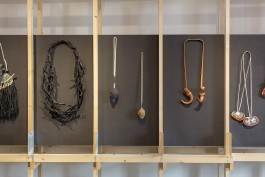 La scénographie lie, comme les maillons d’une même chaîne, les créations présentées : broches, colliers, bracelets, sculptures ou encore performances vidéos.